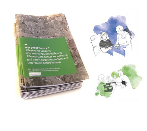 Auch Menschen, die auf der Straße leben, brauchen Pflege. Aber wie soll das gehen, obdachlose Männer und Frauen regelmäßig zu versorgen, zu pflegen, gesundheitlich zu begleiten? Die Koordinierungsstelle Gesundheitliche Chancengleichheit in der Hamburgischen Arbeitsgemeinschaft für Gesundheitsförderung hat die Broschüre „Wer pflegt Herrn K.?“ entwickelt. Uns war es ein besonderes Anliegen, diese Publikation ansprechend und übersichtlich zu gestalten. Best Practice-Beispiele, Informationen für Mitarbeitende der Wohnungslosenhilfe, des Gesundheits- und Pflegesystems und sensible Illustrationen zeigen: Wenn alle zusammenarbeiten, können auch Wohnungslose gut versorgt werden.
