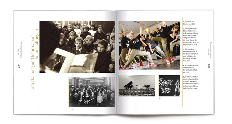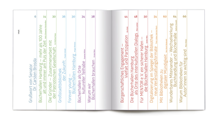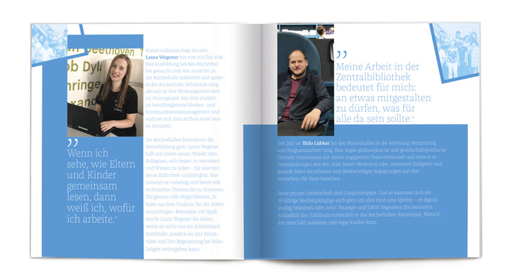 Redaktionell war es uns wichtig, neben fachlichen Beiträgen auch Stimmen von Mitarbeiter*innen und Nutzer*innen einzufangen und den jeweiligen Beitragskategorien gestalterisch ihren eigenen Raum zu geben. Darum entwickelten wir drei grafisch gut erkennbare Lese-Ebenen. Ganzseitige Fotos und großzügige Fotostrecken bebildern zudem sowohl die Geschichte als auch die Gegenwart der Bücherhallen.