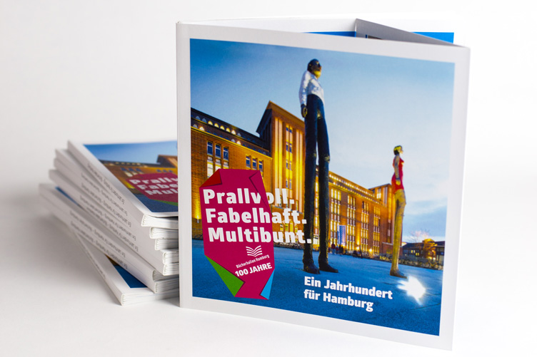 Für die Festschrift zum 100-jährigen Jubiläum haben wir eine besondere Form gewählt: Beim Quadrat wird keine der vier Seiten bevorzugt, darum gilt es auch als Sinnbild der Gerechtigkeit. Die Bücherhallen wiederum stehen allen Hamburger*innen offen und sorgen so ihrerseits für die gerechte Verteilung von Lesespaß, Spielfreude, Bildungslust, Bewegtbildgenuss.