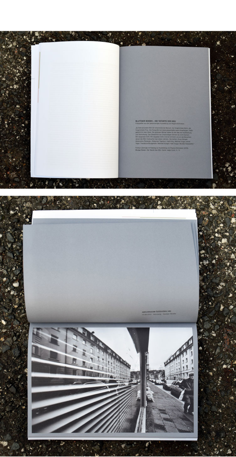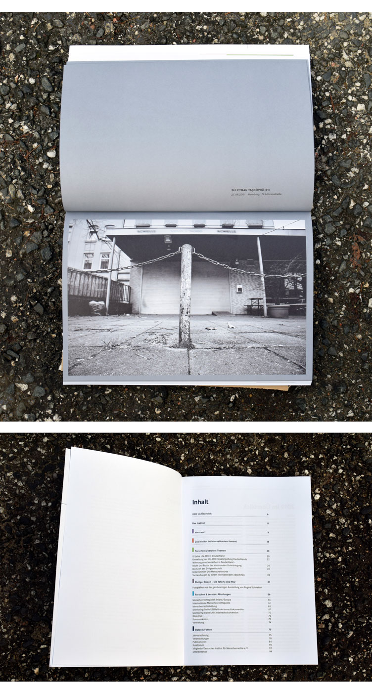 Unsere Gestaltungsarbeit für den Jahresbericht 2019 umfasste eine besondere Aufgabe: In enger Zusammenarbeit mit der Fotografin Regina Schmeken erarbeiteten wir ein gestalterisches Konzept, um die Fotografien aus der Ausstellung „Blutiger Boden – die Tatorte des NSU“ in den Bericht zu integrieren. Regina Schmekens Aufnahmen zeigen die Tatorte – im Großformat, in konzentriertem Schwarz-Weiß, verstörend unauffällig und banal. Diese Bilder brauchen Platz. Daher entschieden wir uns, mit einer Bilderstrecke den Lesefluss zu unterbrechen und die Perspektive zu wechseln – vom Hochformat ins Querformat. Vorsatzseiten sorgen dafür, dass der Blick von Bild zu Bild innehält.
