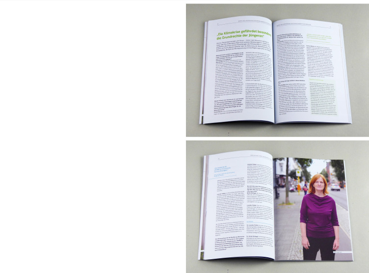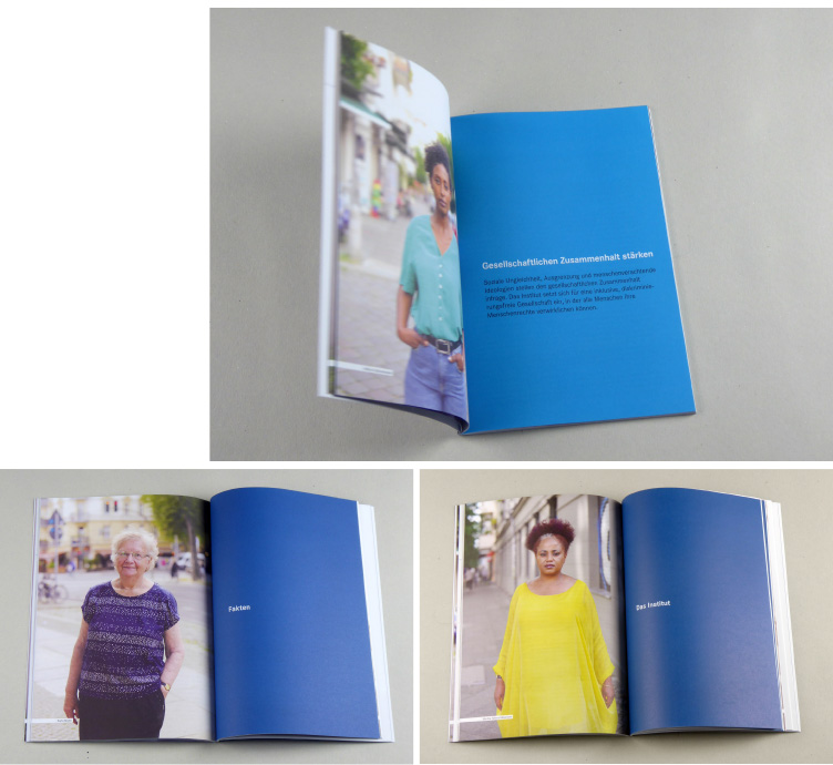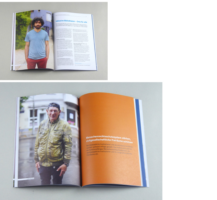 Eine unserer zentralen Aufgaben bei der Gestaltung des Menschenrechtsberichts war es, mittels sensibler Bildredaktion die Porträts der Berliner Fotografin Barbara Dietl in unser Gestaltungskonzept einzubinden. Wir entschieden uns bewusst dafür, die Porträts ganzseitig einzubinden – und immer wieder mit diesen ganzseitigen Porträts den Lesefluss zu unterbrechen, sodass Lesende immer wieder innehalten und erleben können, worum es eigentlich geht: um Menschen und ihre Rechte.
