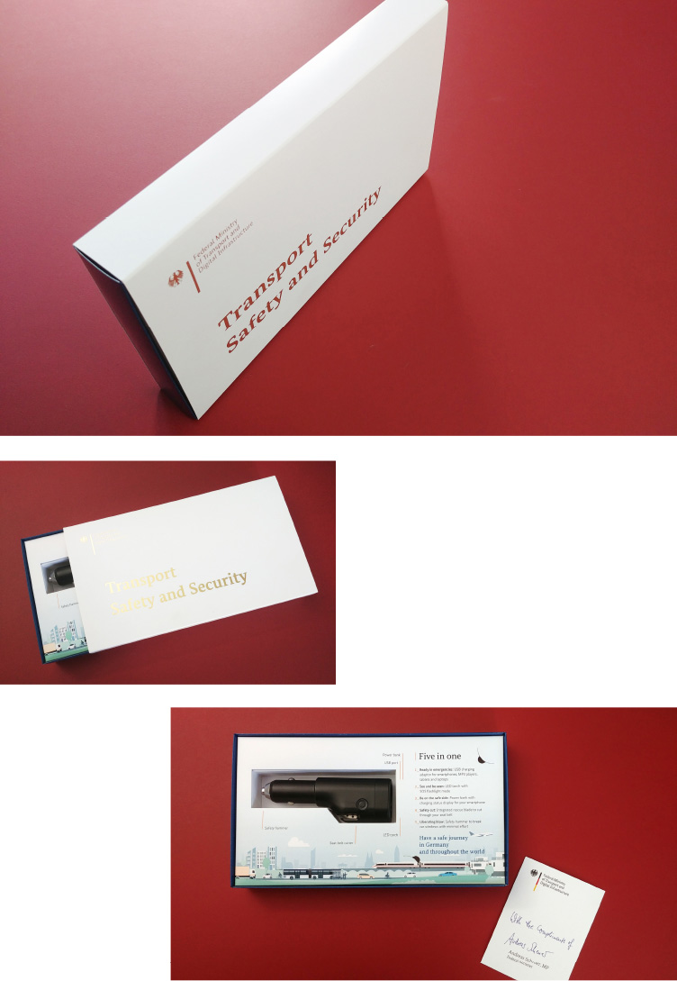 Vom 22. bis 24. Mai 2019 lud das BMVI internationale Gäste zum Weltverkehrsforum (International Transport Forum, ITF) nach Deutschland ein. So vielfältig die Themen rund um den Verkehr der Zukunft, so eindeutig ist ein gemeinsames Anliegen: Sicherheit. Das BMVI entschied sich daher, allen Gästen ein Sicherheits-Multifunktionstool zu überreichen. Wir kümmerten uns um die Verpackungsgestaltung.